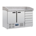 Comptoir de préparation avec plan de travail en granite et espace réfrigéré compatible GN. Contrôleur entièrement automatique avec affichage numérique constant et dégivrage hors cycle.