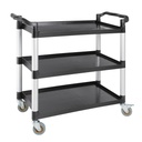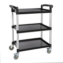 Chariot de service en polypropylène 3 niveaux offrant une grande solidité pour de nombreuses utilisations dans les hôtels, restaurants et collectivités. Poubelle et bac à couverts encliquetables...