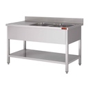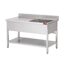 Plonges en acier inoxydable avec étagère basse et dosseret. Dessus en inox 304 et pieds en inox 430. Hauteur de 850mm pouvant être augmentée jusqu'à 920mm grâce aux pieds réglables. Perçage...