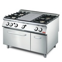 Plaque vitrocéramique 4 zones avec thermostats réglables. Four électrique GN 2/1 avec thermostat, dimensions internes du four 530x340x325mm.