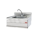 Plonge inox compacte avec robinet, crédence pour éviter les projections et cuve dim. 50x40x15h cm. Fournie avec vidange et bouchon de surverse.